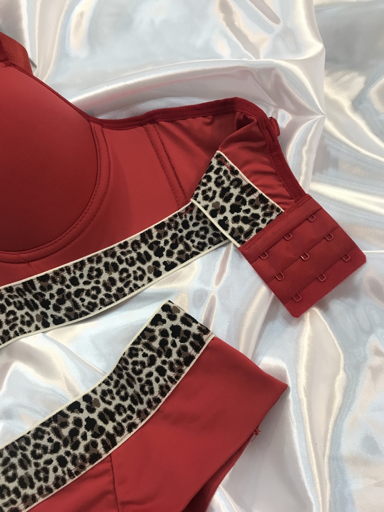 Sua base tem um elástico estampado de animal print, dando um charme ao conjunto.