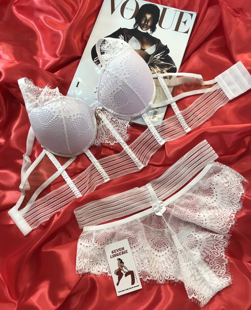 Conjunto Maravilhoso com detalhes em renda, base do sutiã todo em Barbatanas, detalhes em tule, alças reguláveis, com bojo e regulagem tripla.